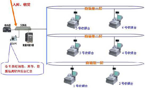 在多層的服裝商場,秘奧采用局域網(wǎng)連接方式把各層的收銀點連接在一起。統(tǒng)一管理、統(tǒng)一經(jīng)營。(關于局域網(wǎng)的解決方案可以參考《局域網(wǎng)連接方案》)下圖為秘奧軟件針對服裝三層商場所做出的解決方案拓撲圖: