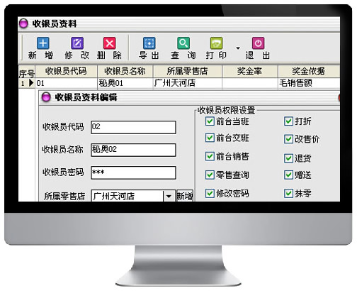 右圖中該商場有34個專賣柜組、6個收銀臺、22個收銀員共三層。該商場的基本資料全部可以在秘奧服裝軟件的后臺管理系統(tǒng)中的前臺管理子系統(tǒng)中設置對應的柜組、收銀臺、收銀員等資料。而秘奧服裝軟件的前臺管理系統(tǒng)直接安裝在各個收銀臺上,在前臺設置時選擇對應的收銀臺即可。